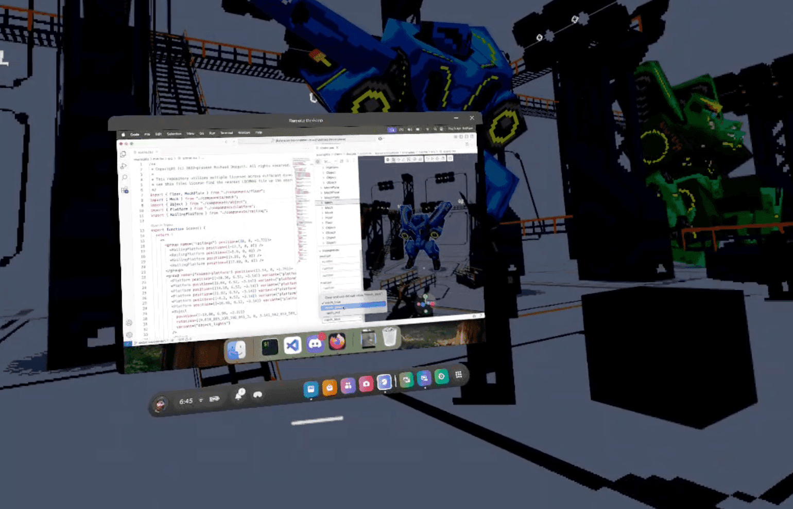 WebXR is a pretty dope piece of tech and React Three Fiber has great support for it thanks to the XR package โ loads of people use it to create immersive experiences for the browser. Triplex now supports opening 3D components in WebXR so you can view, interact, and transform 3D components in your headset.